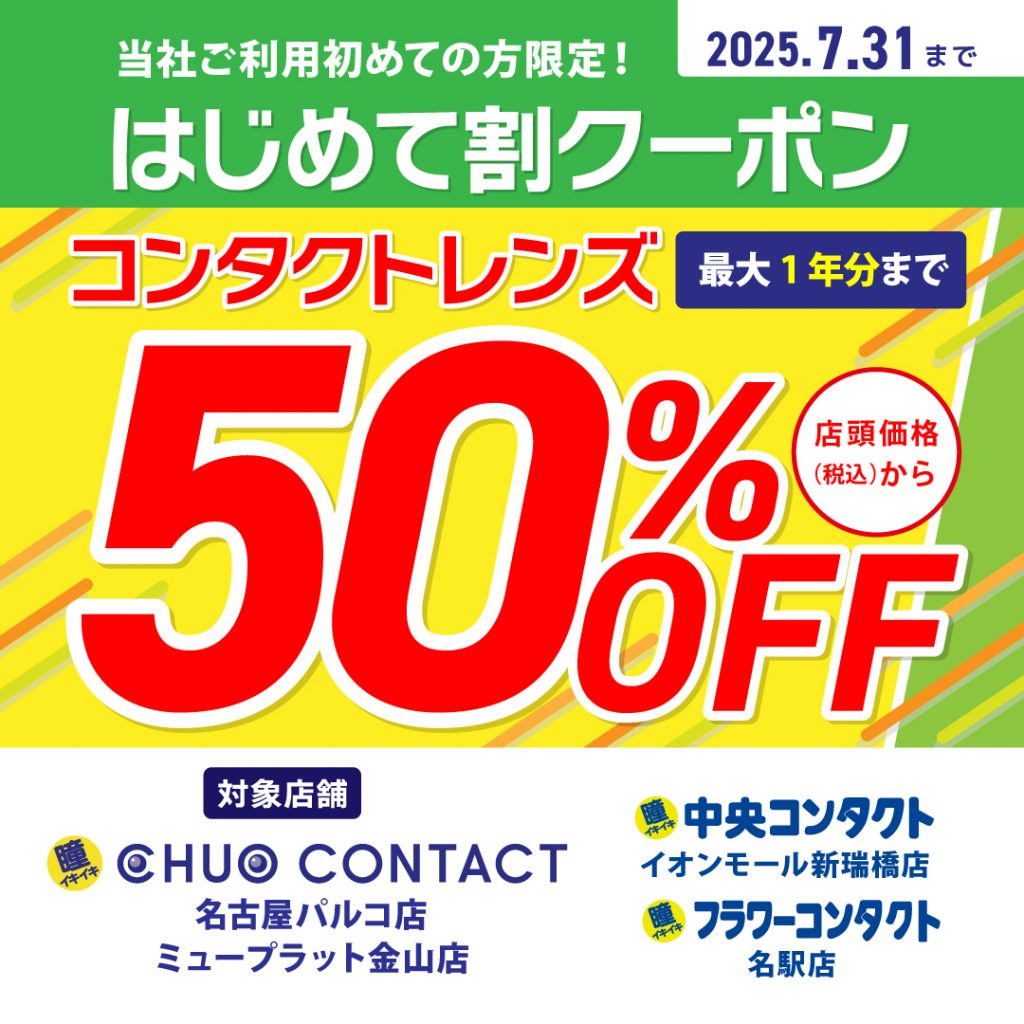 - 店頭価格が1箱3,300円(税込)以上のコンタクトレンズが50%OFF