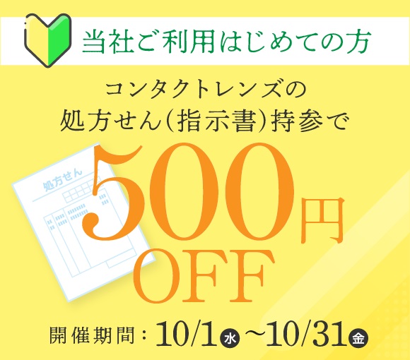 当社ご利用はじめての方はコンタクトレンズの処方せん(指示書)のご持参で、税込5,500円以上のご購入時にその場で500円OFFとなります。