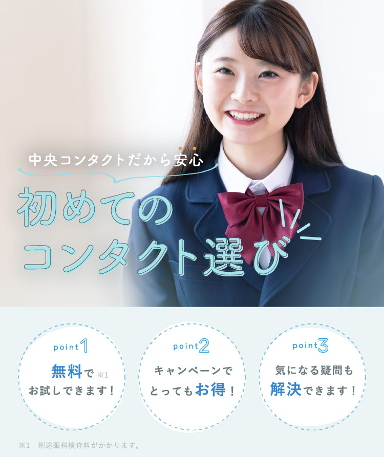 コンタクトを購入してから「しっくりこない」と思ったことはありませんか?中央コンタクトではコンタクトレンズの試着ができます。コンタクトレンズは種類によってつけ心地が異なりますから、いろいろ試して理想の1枚を見つけてください。