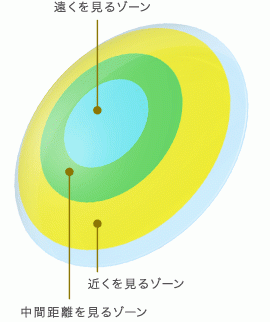 遠くを見るときに使われるレンズの中心部を広く取ったデザインで、近くを見るゾーンとは同心円状に並んでいる「マルチフォーカルデザイン」が特徴。このデザインによって違和感のないピント切替えと、クリアな視界が実現されます。