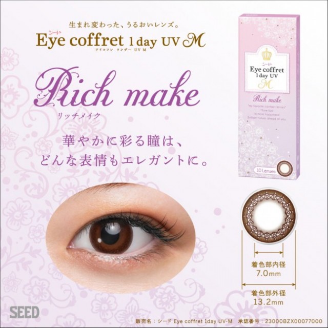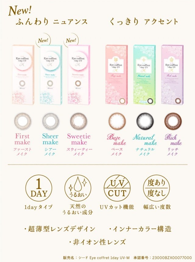 ・レンズカラー ライトブラウン、ブラック、ブラウン、グレー ・ベースカーブ 8.70mm ・度数 +3.00 D〜+0.50 D(0.50 Dステップ)、+0.25 D ±0.00 D、-0.25 D〜-6.00 D(0.25 Dステップ) -6.50 D〜-12.00 D(0.50 Dステップ) ・中心厚 0.05mm(-3.00 Dの場合) ・直径 14.0mm |