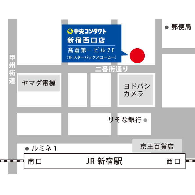 『中央コンタクト新宿西口店』は、新宿駅JR中央西改札から徒歩約3分にございます。
