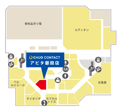 アピタ磐田館内には、食品スーパーやエディオン様、GU様などの様々な専門店があり、ミスタードーナツ様やサイゼリヤ様でのお食事を楽しみながら、お買物ついでにコンタクトレンズ、レンズケア用品を購入できます。