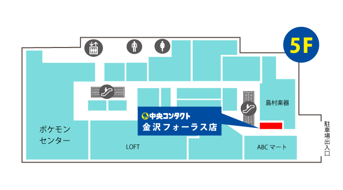 金沢駅からすぐの金沢フォーラスの5階にございます。 ABCマート様、ポケモンセンター様、LOFT様、無印良品様と同じフロアにあり、お買物のついでにコンタクトレンズの購入ができます。