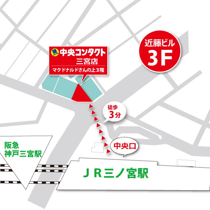 当店はJR三宮駅からお越しの方はJR三宮駅「西出口」、阪急三宮駅からお越しの方は阪急三宮駅「東出口」を出て、北側に徒歩2分。