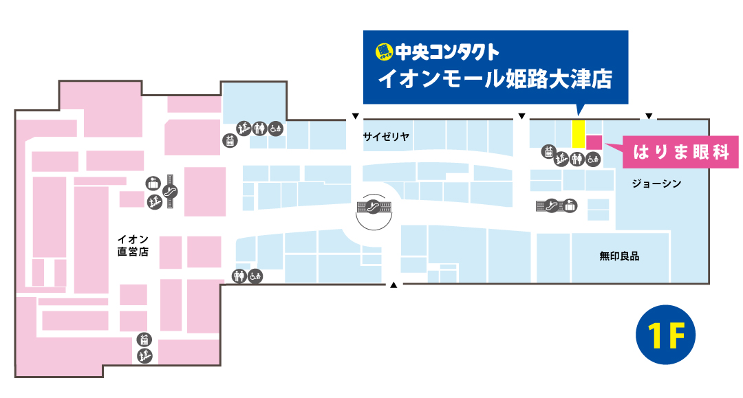 当店はイオンモール姫路大津店の中にございます。当施設にはスーパーや家電量販店・アパレル・カフェなど様々な専門店があり、お食事やお買物を楽しみながらコンタクトレンズを購入していただけます!