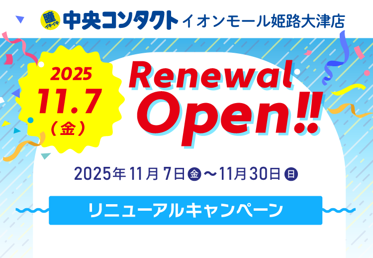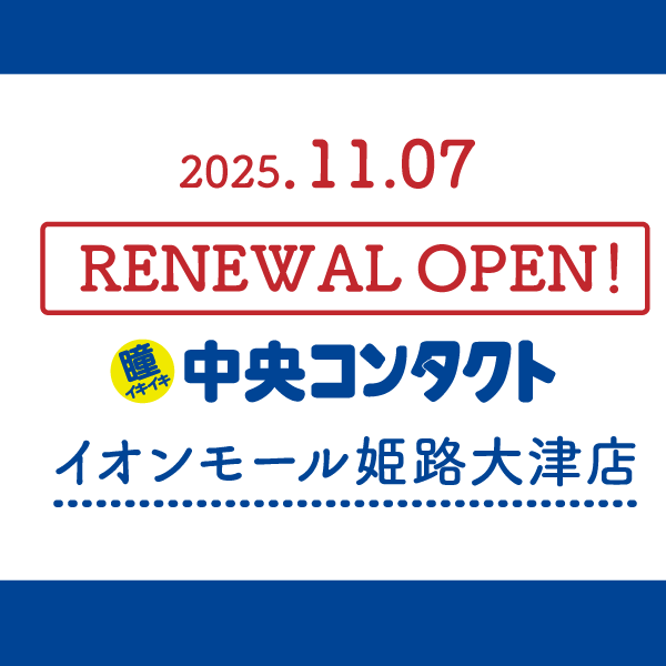 平素は格別のご愛顧を賜わり、厚くお礼申しあげます。「中央コンタクト イオンモール姫路大津店」はリニューアル工事のため、11/5(水)は休業とさせていただきます。お客様にはご不便とご迷惑をおかけいたしますが、ご了承の程、よ…