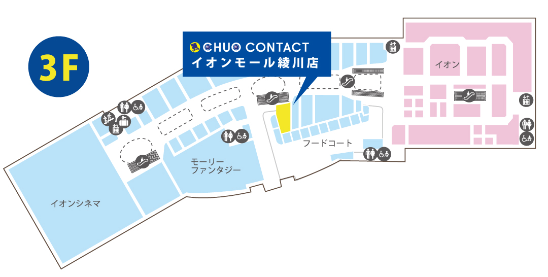 当店は、イオンモール綾川店の2.Fにございます。 ショッピングセンターでのお買物やお食事も楽しめて気軽にお立ち寄りいただけるショップです。