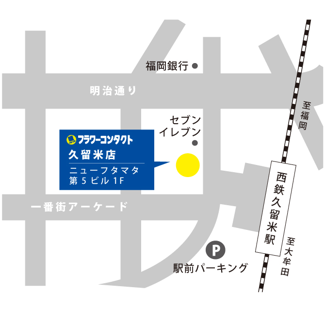 当店は西鉄久留米駅より徒歩1分! 西鉄久留米駅西口を出て横断歩道を渡ると正面にセブンイレブンさんがあり、その左隣のビルの1階にございます。黄色い建物が目印です。