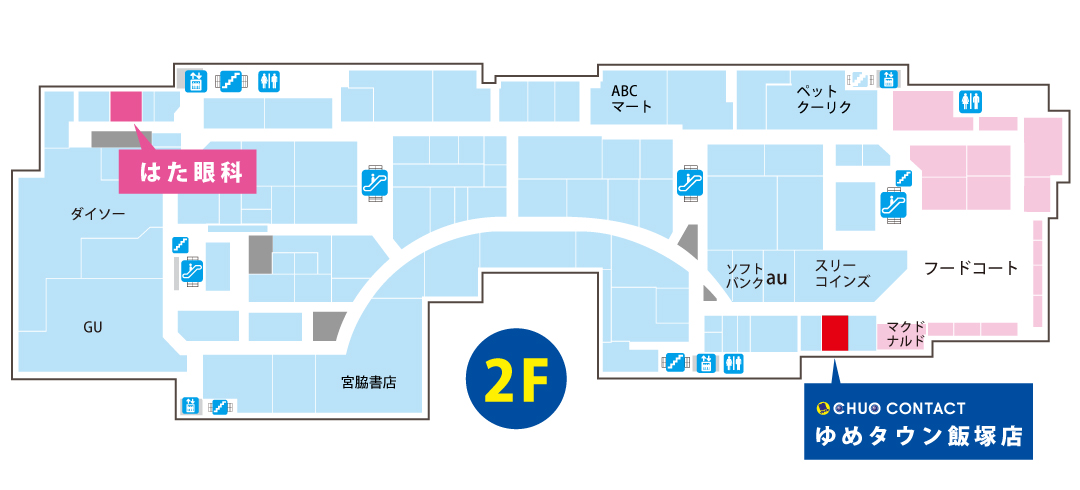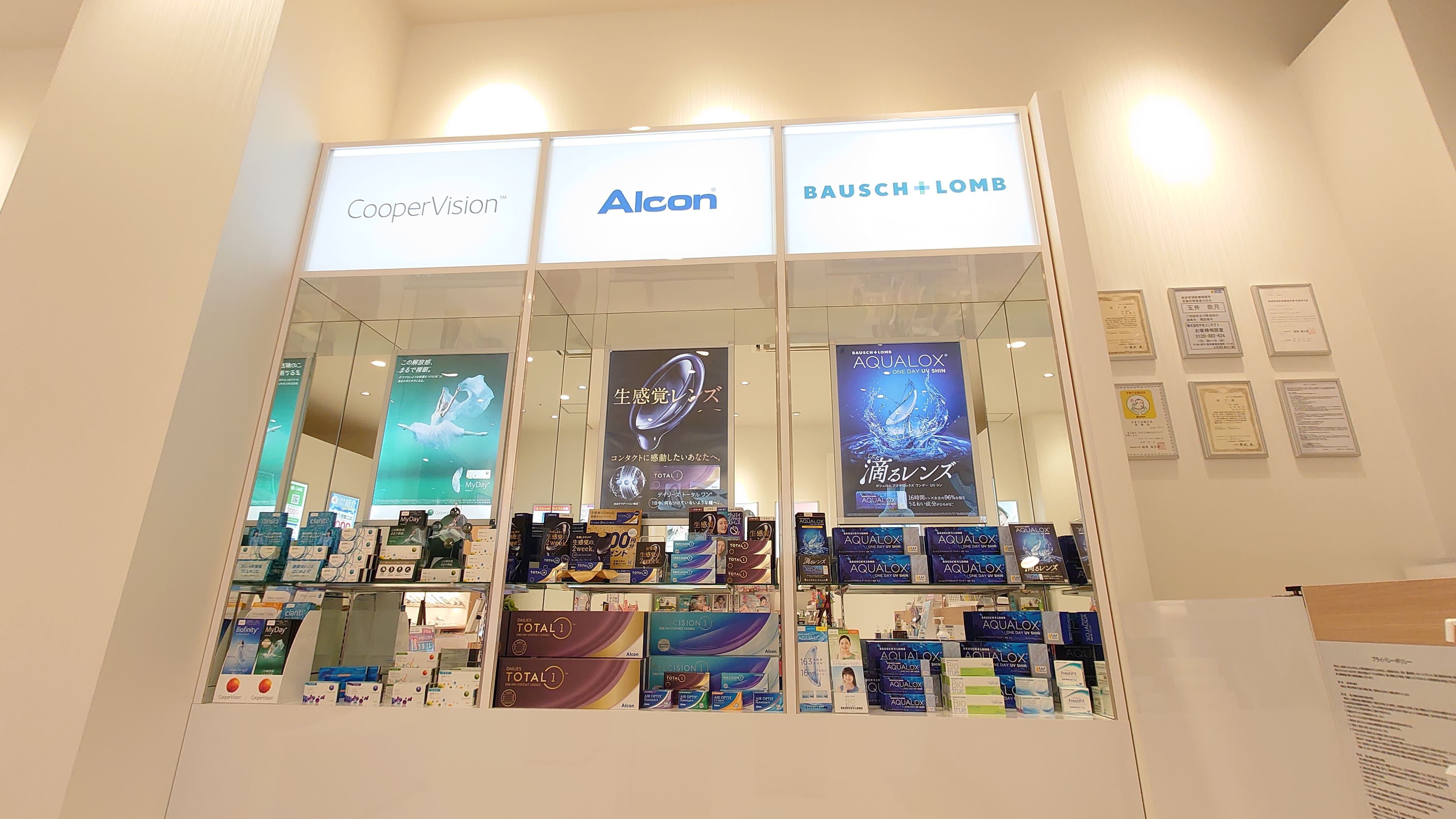 当店はゆめタウン飯塚の2階にございます。館内には土日祝日も処方可能な「はた眼科」があり、度数の調整、新商品のお試しもできます。