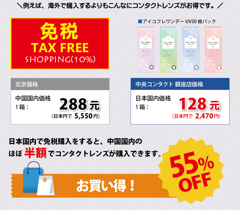 各店舗にてコンタクトレンズの免税販売を取り扱っております。