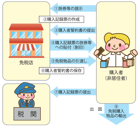 | 輸出 | ⑦非居住者は、出国の際に税関にパスポート等に貼付された購入記録票を提出します。 ⑧非居住者は、購入した免税物品を携帯して国外へ持ち出します。 ※非居住者は免税物品を出国前に他人に譲渡してはいけません。 ※飲料類、化粧品類等における液体物は、国際線においては客室内への持込制限があるので、 受託手荷物とする必要があります。 |