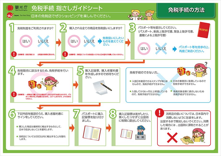 | 「購入記録票」 「購入者誓約書」の作成 | ②免税店は「購入記録票」を作成します。 ③非居住者は免税店に「購入者誓約書」にサインをして提出します。 ④免税店は「購入記録票」を非居住者のパスポート等へ貼付し割印します。 ⑤免税店は商品を非居住者に引き渡します。 ⑥免税店は非居住者から提出を受けた「購入者誓約書」を保存します(約7年)。 |